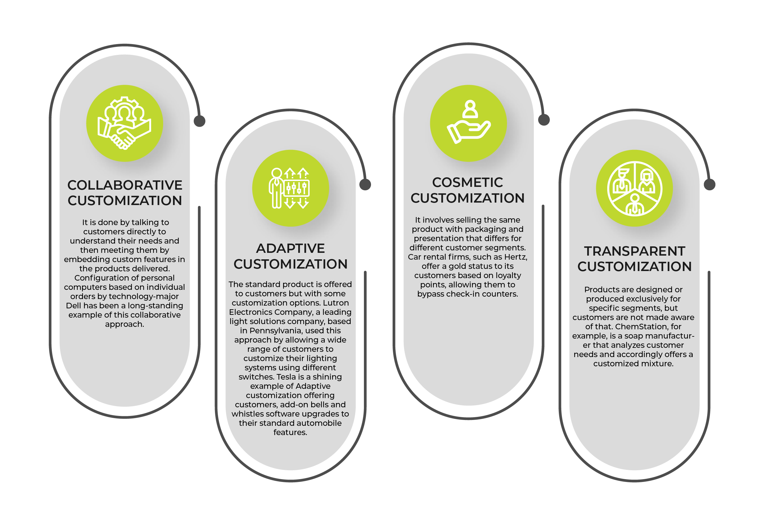 Traditional business models pedaled products that were either standardized for the masses or customized for a select few. But with new technologies offering flexibilities in production, what we’re witnessing now is democratization and customization for the masses. It’s all about giving customers control by allowing them to ‘choose how they use’ one’s product or service. Customization is done either in product features, in its presentation or both, while the approach could be collaborative, transparent, adaptive or cosmetic. Volkswagen/Volvo have done at-scale customized car manufacturing.
